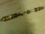 The time had come, the rubber sleeve that covers the front arm shock was cut/torn in a couple places, wasn't sure what could cause that, this is until I got it off the shock. When I hammered the bolt out of the mounts and pulled the shock from the frame I grabbled the cover and pulled, and when the cover came off the shock rod/piston assembly came with it, and a pile of dry red powder fell onto the floor. That would be what should have been fluid. Ugh.