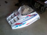 Well the little white knight was cleaned up this weekend, this is a specialty of #5 as everyone knows, I can't help myself even when it is snow on the machine, I am always cleaning. I'm happy to report the sticky stuff washed away quite easily but I can't say the same for the CONCRETE SPLATTERED all over the machine! #3 or #4 you must be publicly reprimanded for this unwanton mistreatment of a snow machine. More care should have been taken to move a snowmobile away from the construction site. Shame shame. But the white hood came nice and clean and looks fantastic-I really like the decal design they did on this sled.