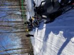 Either way, the trails soon went into full mogul mode and everyone made the best of it to get through. We all put the hammer down and had our 2nd winds kick in for the last stretch back to the drop point. The prez did an excellent job routing us to get a 125 Mile day in. Loading up was amateur hour for me...I've been spoiled by not needing a trailer. After firing up my sled to load I went to pull forward and smelled that familiar belt smell...it was finally smoked. Putting it in reverse to get some more running room only squirted slush mud all over #5's trailer. To make matters worse, I new I had 1 shot to get on the trailer and gave it a go...the belt caught and I came up the trailer hot and took some life off my right ski against #5's sharp edges spindle. It wasn't my most prized moment but the only damaged was my ski and some pride.